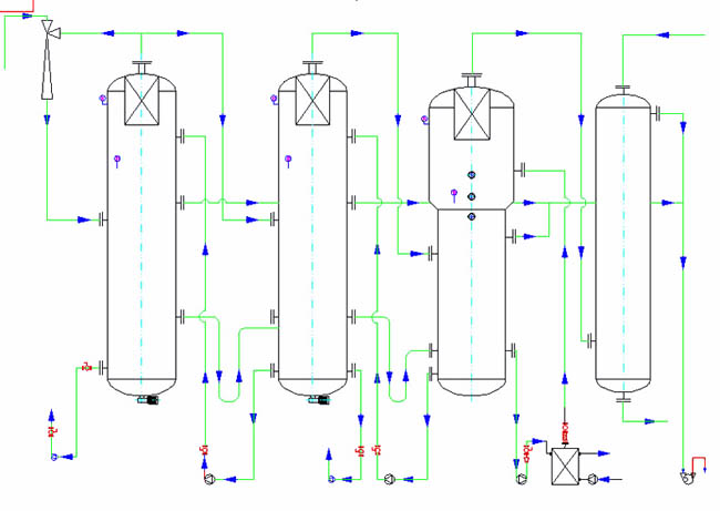 多效蒸發是將多台蒸發器首尾相接,串聯(lián)操作的蒸發係(xì)統,除一效使用加(jiā)熱蒸(zhēng)汽外,其餘各效均利(lì)用上一效產生的二次蒸汽,末效二次蒸汽用於物料預熱,不但節約生蒸汽,也節約冷(lěng)卻(què)水用量。