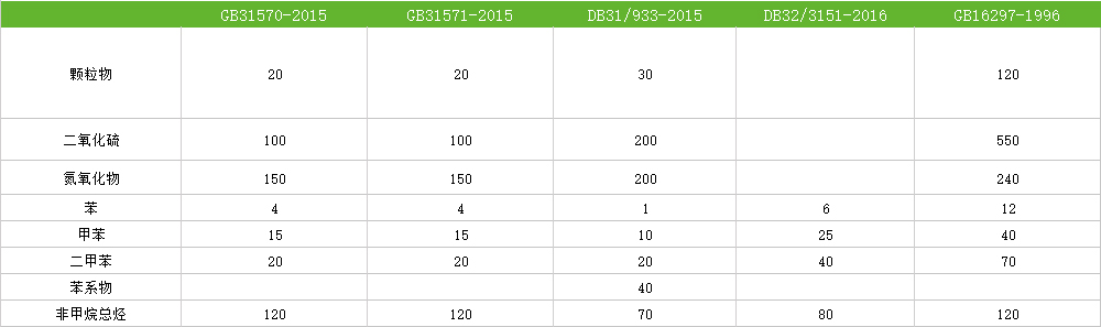 部分國標和地(dì)標中(zhōng)關於(yú)大氣汙染物允許排放(fàng)濃(nóng)度限值:濃度單位:mg/m3