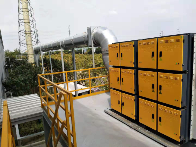 (2)經預處理後的廢氣(qì)進入UW光解設備中,在該裝置中,UV紫外線光(guāng)束及臭氧對廢氣氣體進行協同分解氧化反應,使廢氣氣(qì)體轉(zhuǎn)化成低分子化合物、水K和二氧化(huà)碳,淨(jìng)化後的氣體經過(guò)排氣筒達標排放。
