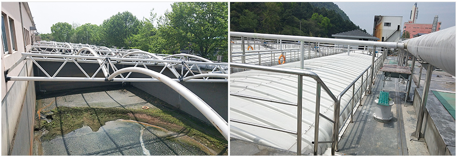 在汙水池上(shàng)方增設加蓋處理,此時汙水池中產(chǎn)生的廢氣與(yǔ)空氣隔絕,在集氣罩表麵增設出氣口,並安裝通風管道,廢氣由通風(fēng)管道進入廢(fèi)氣淨化塔,為加(jiā)大廢氣收集,在淨化塔前安裝玻(bō)璃鋼風機(jī),由風機將廢氣(qì)吸入噴淋塔(tǎ),廢氣(qì)在塔內(nèi)經兩級噴淋,若廢氣呈(chéng)酸性則采用堿(jiǎn)液(yè)循環吸(xī)收,若廢氣呈堿性則采用酸液循環噴淋吸收,廢氣處理效率達90%以上,排放達到有關(guān)標準。